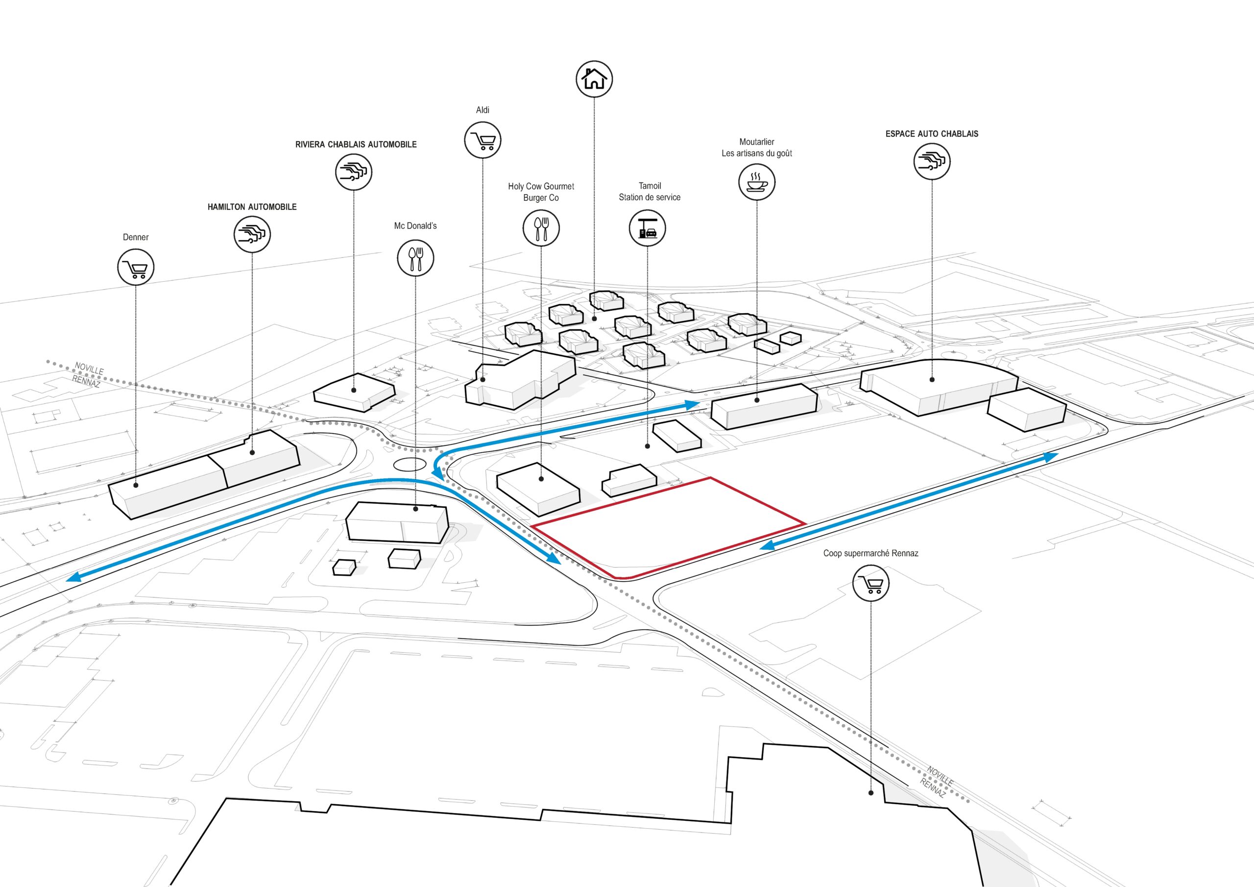 Ce projet constitue la dernière opportunité d’implantation commerciale autorisée dans la région. Situé au sein d’une zone d’activités stratégiquement positionnée et parfaitement desservie, il offre la possibilité d’aménager une surface de vente ou un showroom jusqu’à 1’000 m², conformément aux dispositions du PPA. Aucune autre surface à vocation commerciale n’est actuellement disponible ou en développement dans le périmètre.
